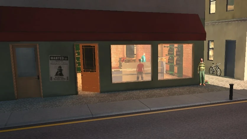 The convenience store is across the street from the Skyscraper, between Weathers and the Alley.