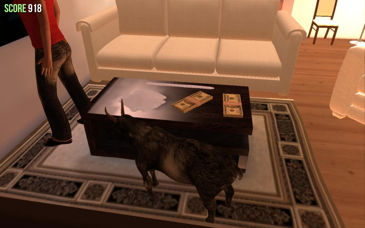 Only two rooms in the house can be entered. The larger of the two contains a table holding two stacks of money and a white substance the game insists is sugar. Licking the "sugar" gives you a Sugar Rush, altering the colors and enhancing your speed for twenty seconds.